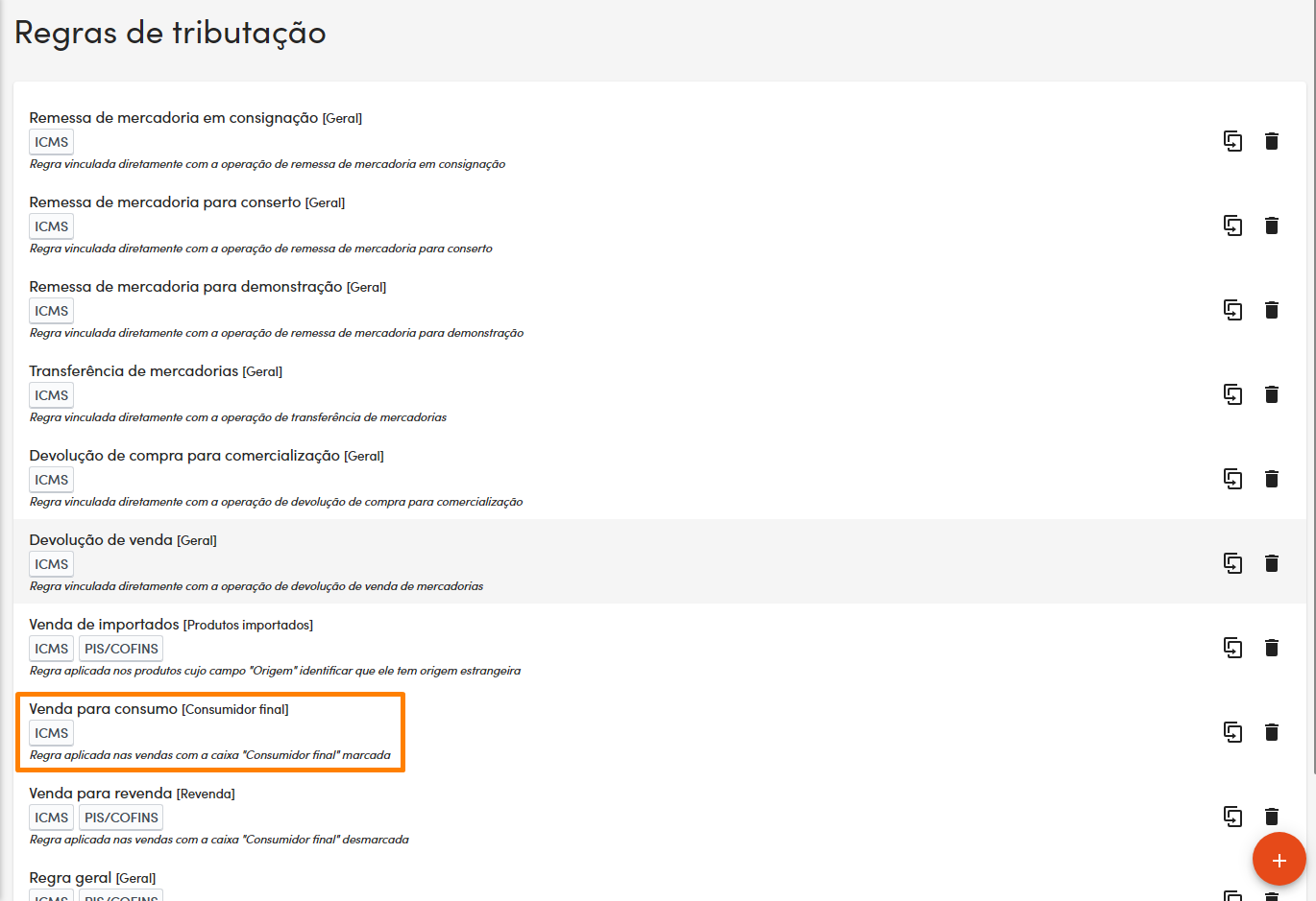 Neste exemplo é a regra chamada venda para consumo que devemos alterar.
